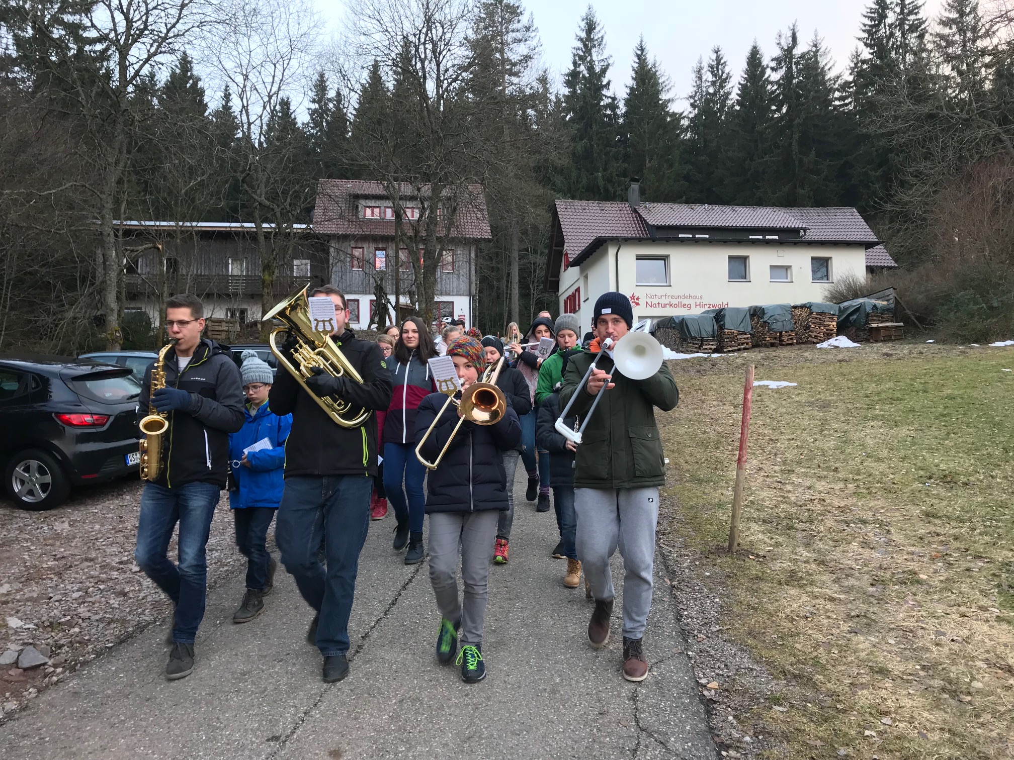 Nach einem Frühstück am Samstagmorgen, besuchten die kleinsten der Musik - die Pimpfoniker - unsere Jugendlichen auf der Hütte um zusammen eine kleine Marschprobe für die anstehenden Fasnetumzüge zu machen. Angeführt von Dirigenten Manuel Schwörer übten das Jugendorchester gemeinsam mit den Pimpfonikern verschiedene Choreographien. Mit diesem Können stehen unsere Jungmusiker nun unserem großen Orchester in Sachen Marschieren in nichts nach. Nach einer Stärkung in Form von Burgern, ging es mit einer Anspielprobe weiter, wobei der Villinger Narrenmarsch laut Hüttenwartin den Hirzwälder Staub aus der Decke rieseln ließ. Bewaffnet mit Instrument, Marschgabel und Noten, spielten sie auch draußen weiter und brachten so ein bisschen Villinger Fasnet in diesen verschlafenen Teil des Schwarzwaldes. Am Abend verabschiedeten sich die Pimpfoniker von der Hütte. Unser Jugendorchester verbrachte den Abend noch mit einer gruseligen Fackelwanderung und einem anschließenden Punschempfang am Lagerfeuer.