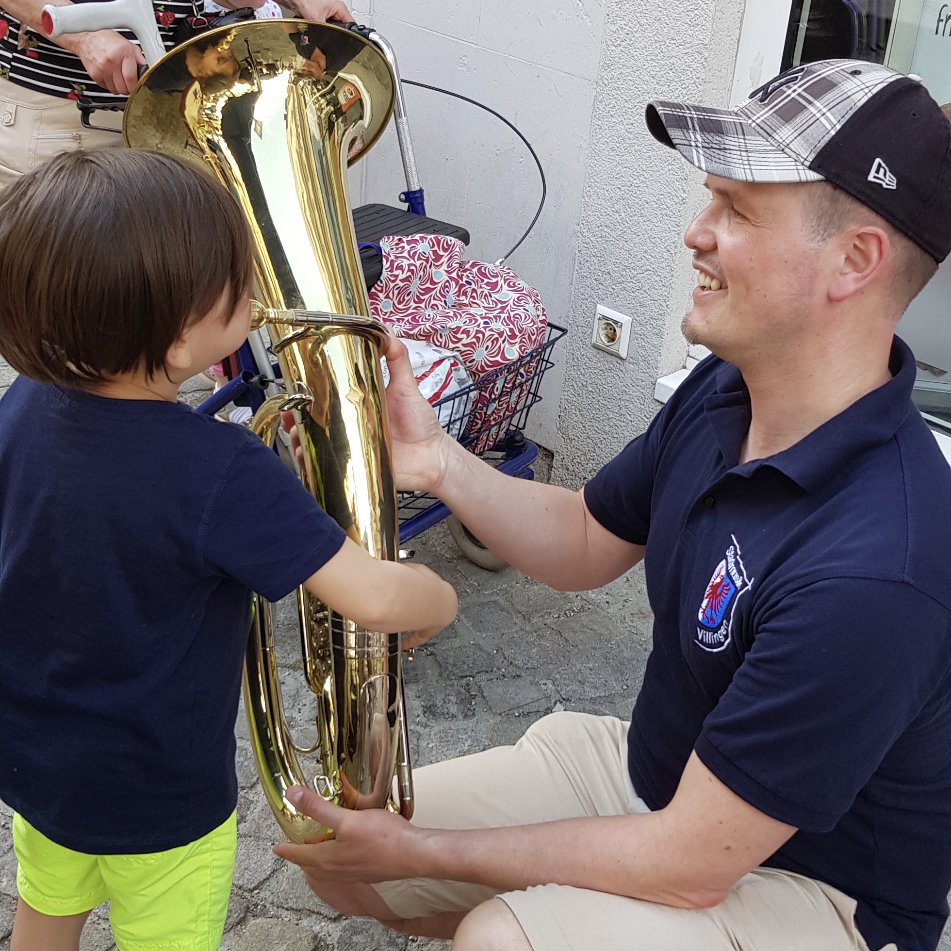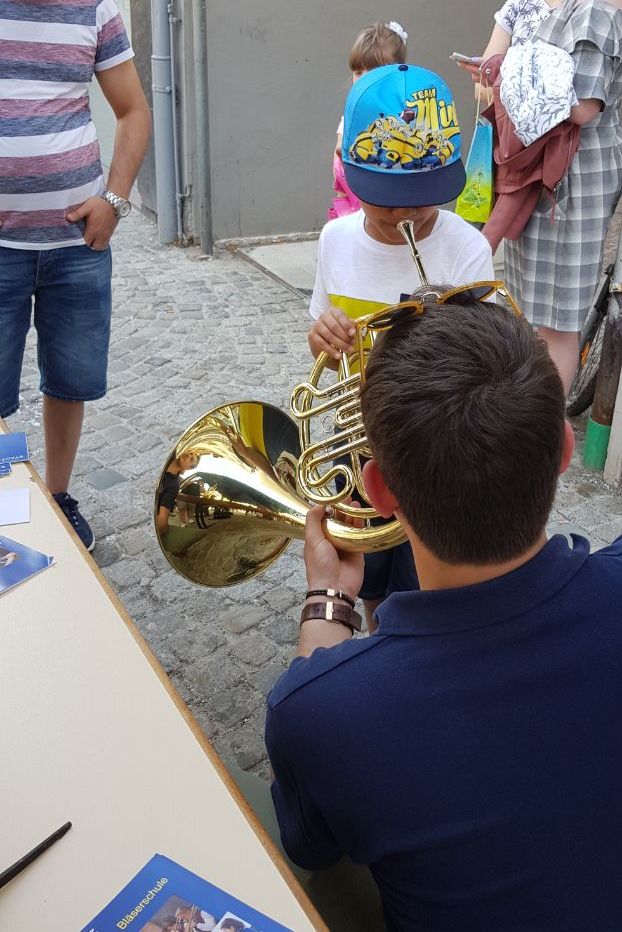 Ausgestattet mit Instrumenten, Pavillions und motivierten Musikern, konnten die Kinder nun kommen - und es kamen auch sehr viele. Das für die Kinder als Station geplante Quiz wurde beim Anblick der vielen Instrumente schnell zur Nebensache. Natürlich war es für die Kinder eine Freude,jedes einzelne Instrument einmal anzuspielen. So war in der Niederstraße ganz getreu dem Motto „Wa trummlet au un bloset wa macht au so n krach“ die lautesten Töne verschiedenster Instrumente zu hören. Einmal in die Hand genommen wollten so manche Kinder das Instrument gar nicht mehr weglegen. So hatten unsere Musiker größte Mühe die kleinen zukünftigen Musiker einzubremsen so dass diese sich nicht vor lauter Eifer übernahmen und komplett außer Puste gerieten. Mit strahlendem Lächeln und aller Kraft spielten die Kleinen was das Zeug hielt, egal ob Saxophone Klarinette oder Tenorhorn - kein Instrument war zu kompliziert, zu schwer oder zu groß. Auch die Eltern waren hellauf begeistert,ihre Schützlinge so zu sehen. Das eigentliche Quiz bewältigten alle dann mit Leichtigkeit.